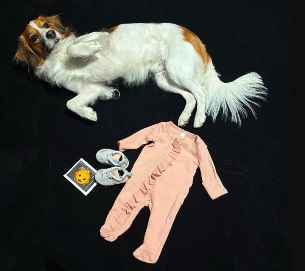 写真には、上に寝転がった愛犬のデコピン、その下にエコー写真と見られるものと、大谷翔平選手とスポンサー契約を結ぶシューズブランド「ニューバランス」のものとみられるベビーシューズ、ワッフル素材で前面についたフリルが特徴的なピンクのベビーロンパースが写っています。