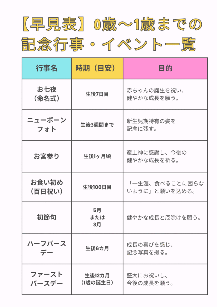 0歳から1歳までのイベントや行事について、網羅的にご紹介しました。