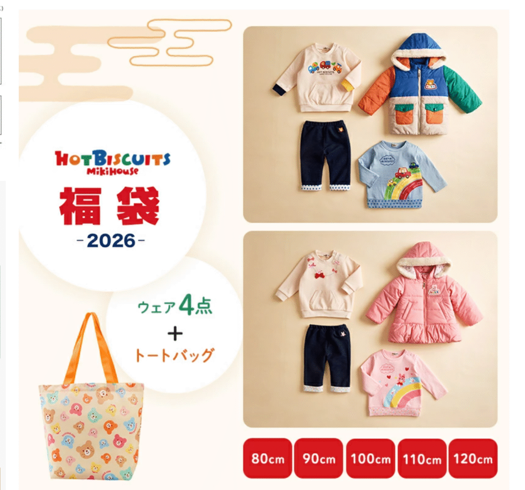 衣類では新生児用の出産準備向けやミキハウス、アウター用の福袋など様々な種類の福袋が用意されています。