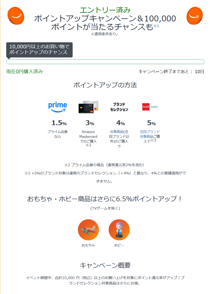 - セール開始前に、Amazonのキャンペーンページで**「エントリーする」**ボタンをタップ。