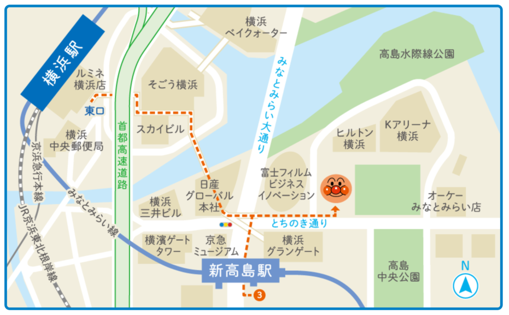 横浜アンパンマンミュージアムの最寄り駅は、みなとみらい線の「新高島駅」です。3番出口から徒歩約3分で到着します。