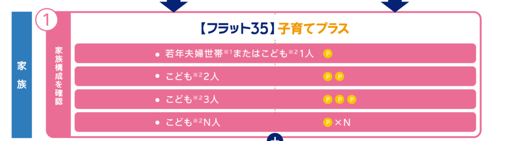 まずは、フラット35の最新ルールである「ポイント制(子育てプラス)」をおさらいしましょう。これは、住宅の性能や家族構成に応じて「ポイント」が貯まり、そのポイント数に応じて金利が引き下げられる仕組みです。
