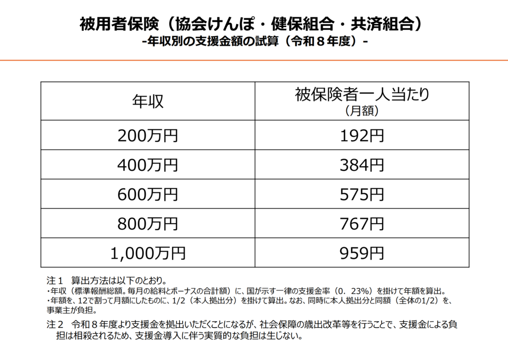 これが最大のマイナス点です。支援の財源として、健康保険料に上乗せして徴収されます。年収により月数百円〜千円程度の負担増となり、「せっかく給付金をもらっても、毎月の社会保険料で相殺される」という不満の声も出ています。