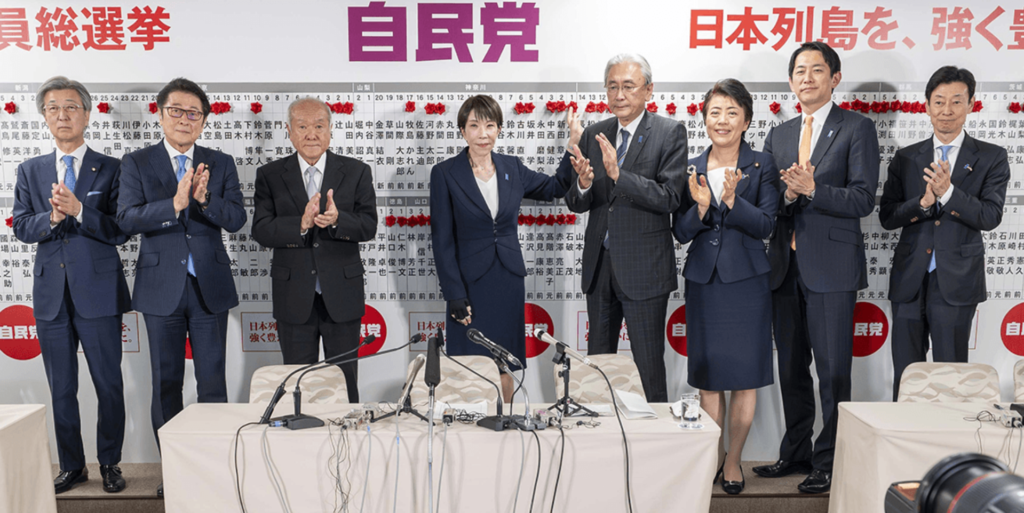 党本部の開票センターで高市早苗総裁を中心に、各候補者の当選を祝う党役員