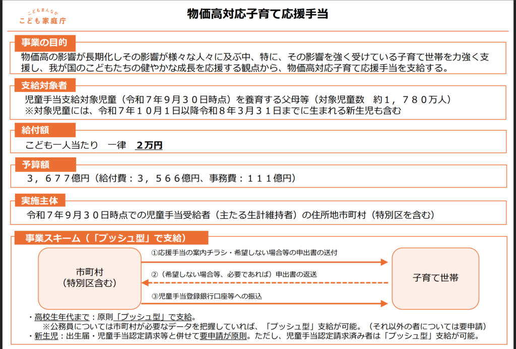 政府の総合経済対策として決定された子育て世帯向け給付(児童1人あたり2万円)は、2026年2~3月ごろから自治体を通じて順次支給されます。