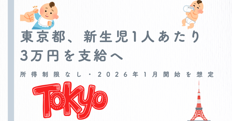 東京都は、出産後の家庭の経済的負担を軽減するため、新生児1人あたり一時金として3万円(ギフトカード)を支給する方針を固めました。