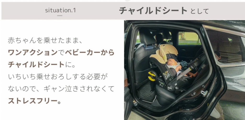 最大の特徴は、「ベビーカーとチャイルドシートが一体化」している点です。