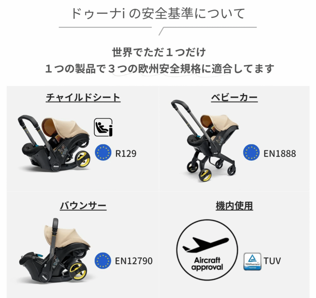 航空機内での使用もできる「doona(ドゥーナ)」は、ベビーカー、チャイルドシート、ゆりかごのスリーウェイすべてで、世界最高レベルのEU及び米国の安全基準をクリアしています。