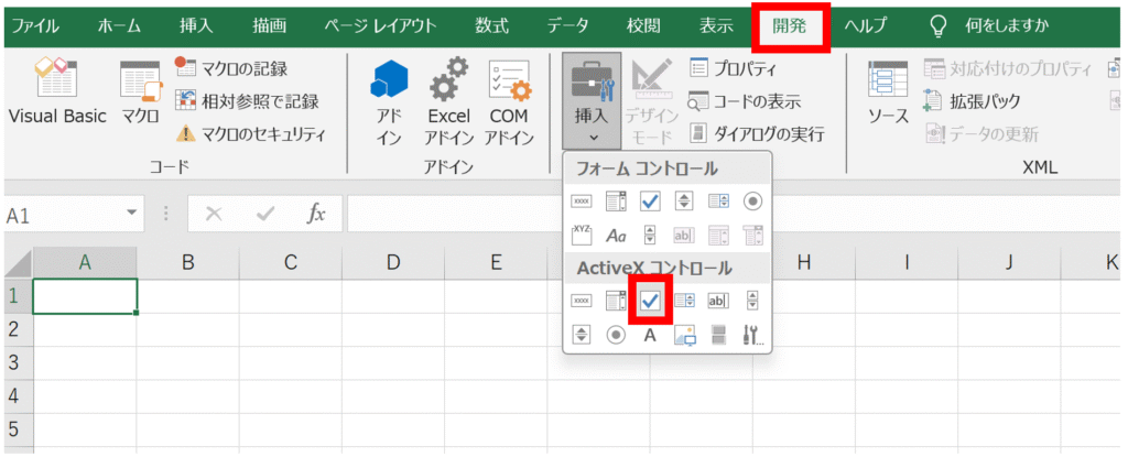 - 表示されたプルダウンメニューの「ActiveXコントロール」グループの中にある、チェックボックスのアイコン(左上の角がチェックされているアイコン)をクリックします。