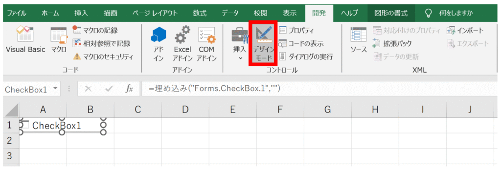 - チェックボックスが選択されていることを確認します(もし選択されていなければ、「開発」タブの「デザインモード」がONの状態で、チェックボックスをクリックしてください)。