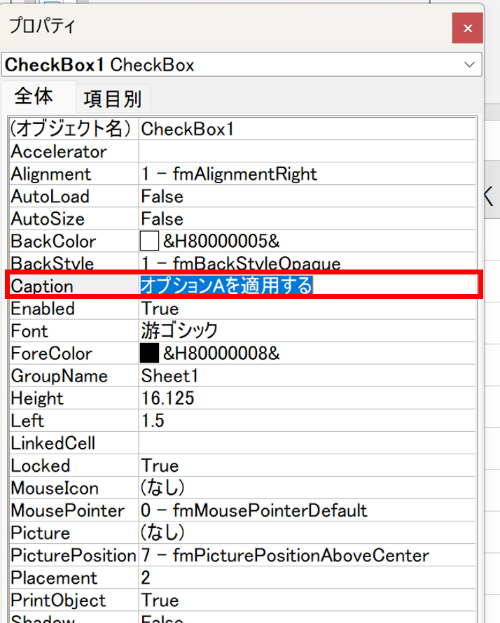 - (Caption)の右側の欄に、表示したい名前(例:「オプションAを適用する」)を入力します。