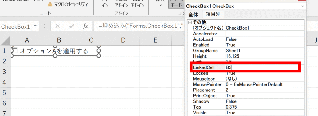 | LinkedCell | チェックボックスの状態(TrueまたはFalse)を書き出すセル。VBAを使わない連携に便利。 | 例:A1(セルA1にON/OFFが出力されます) |