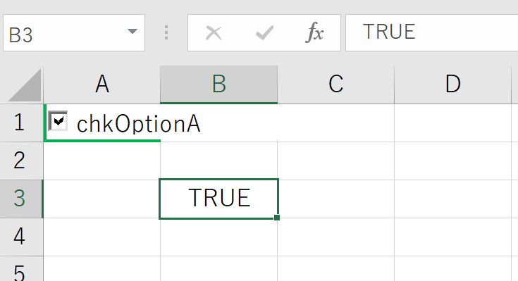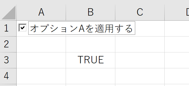 - チェックボックスをクリックすると、設定したセル(B3)にTRUE(チェックON)またはFALSE(チェックOFF)が自動で書き込まれます。