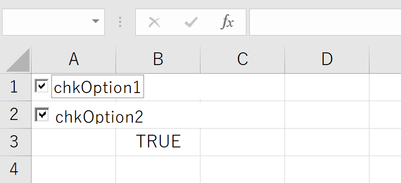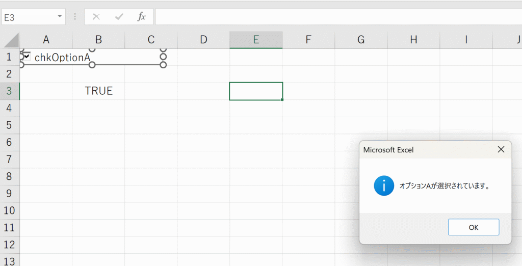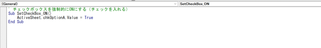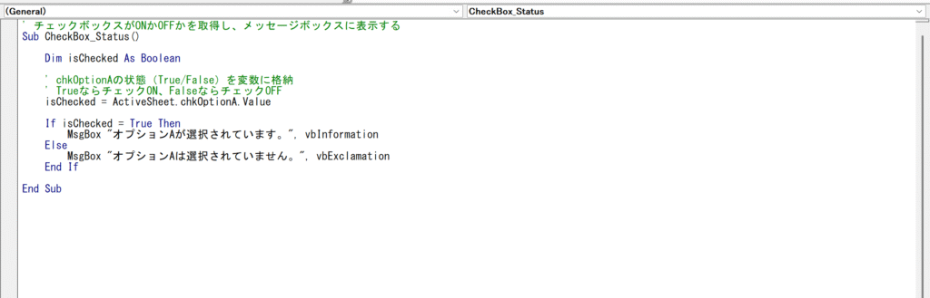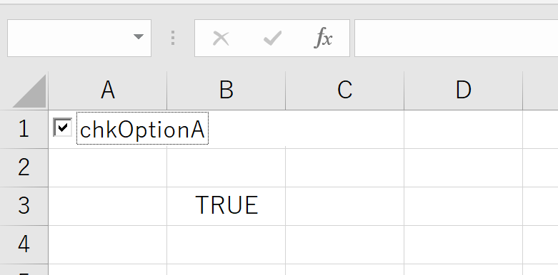 ActiveXコントロールのチェックボックスの名前をchkOptionAとした場合、VBAでその状態を知るコードは以下のようになります。
