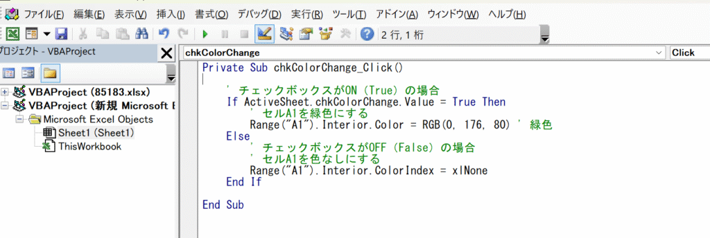 このコードを書いたら、デザインモードを解除して、チェックボックスをクリックしてみてください。セルA1の色が緑色に変わるはずです!