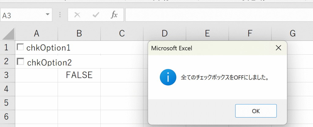 MsgBox “全てのチェックボックスをOFFにしました。”, vbInformation