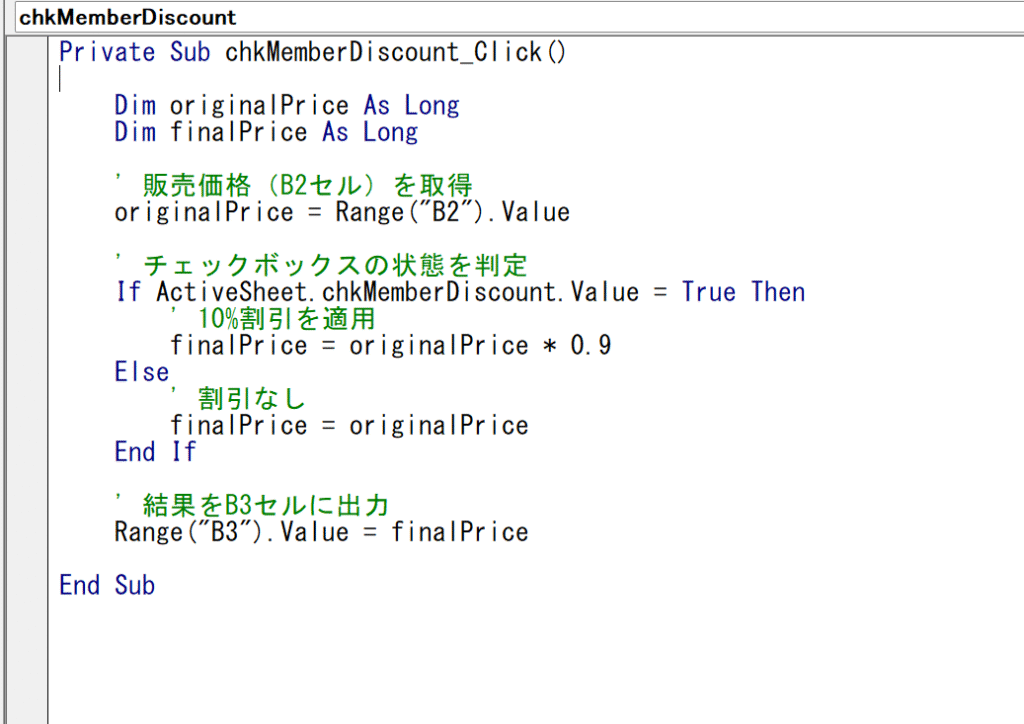 例えば、「チェックを入れたら特定の計算を実行する」「チェックを外したら色を変える」といった、細かく、複雑な動作をVBAコードで簡単にプログラミングできます。
