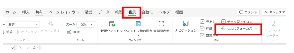 - 表示されたダイアログボックスの「セルにフォーカス」をクリックします。
