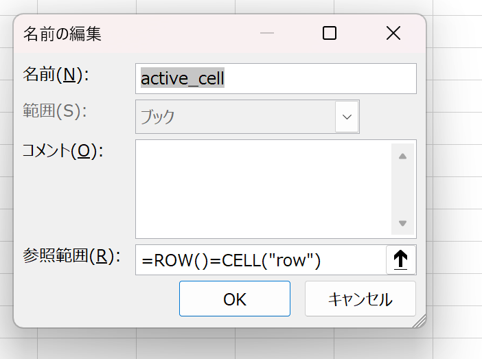 - 「参照範囲」に、以下の数式をコピー&ペーストします。 =ROW()=CELL(“row”)