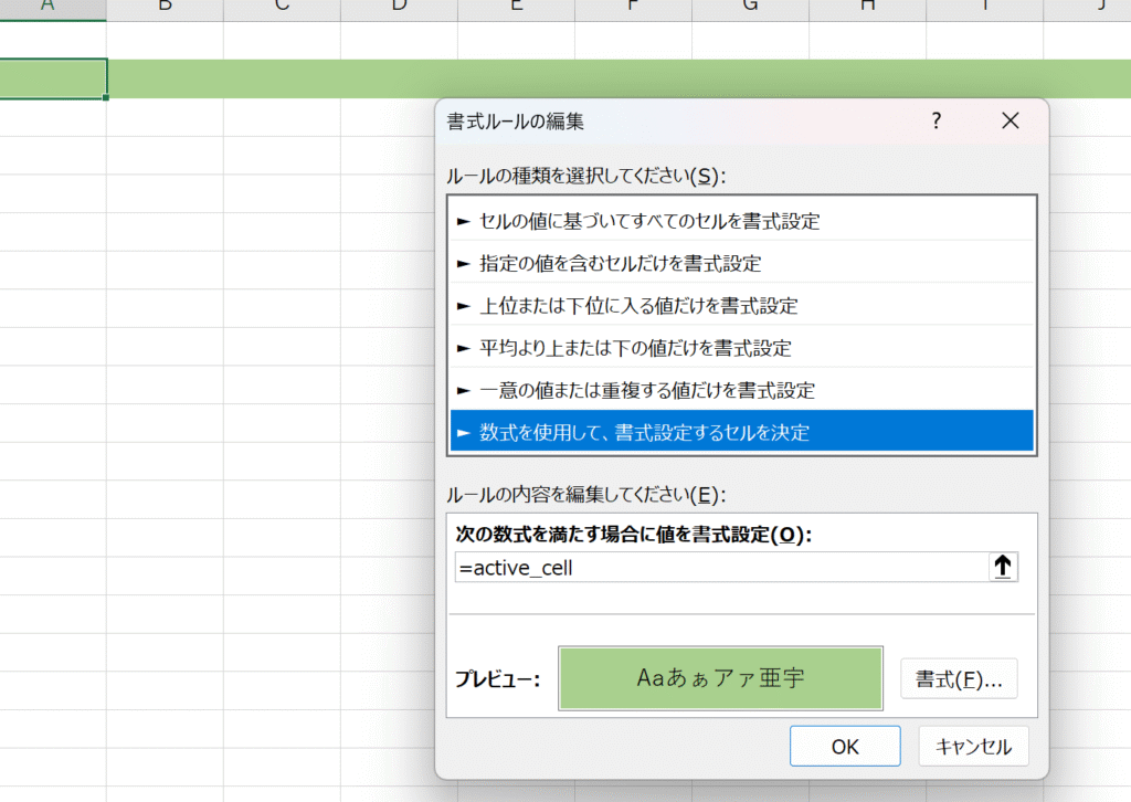 - 「数式を使用して、書式設定するセルを決定」を選択。