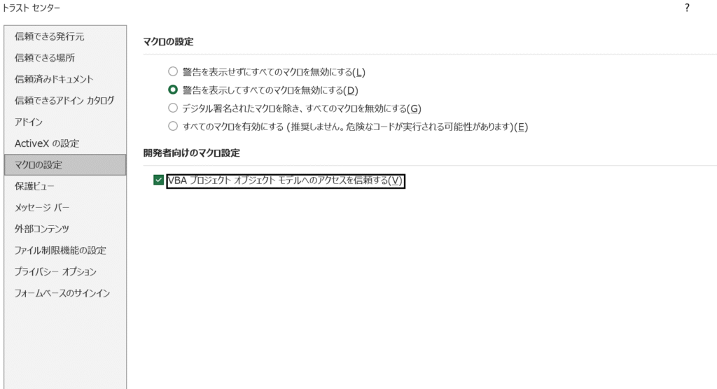 まず、「開発」タブを表示し、マクロの設定を「VBAプロジェクト オブジェクトモデルへのアクセスを信頼する」にチェックを入れて有効にします。