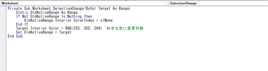 Cells.Interior.ColorIndex = xlNone ‘ 選択された列全体に色を付ける Target.EntireColumn.Interior.Color = RGB(255, 255, 204) End Sub