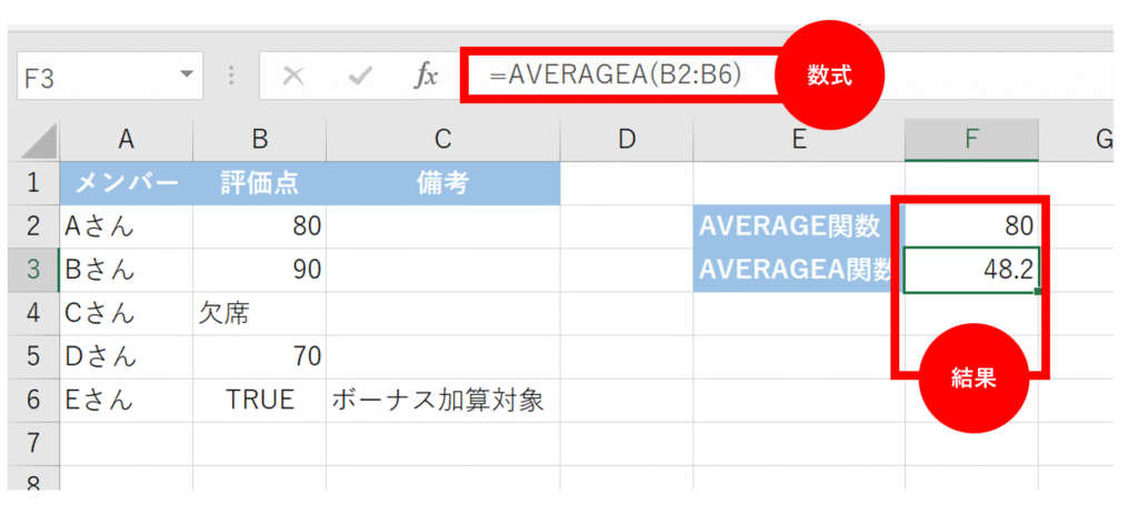 - AVERAGEA関数の結果: 48.2 → (80 + 90 + 0 + 70 + 1) / 5 = 48.2