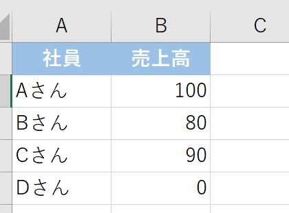 以下の表は、社員の売上データです。売上0円の社員(Dさん)を計算から除外して平均を出したいとします。