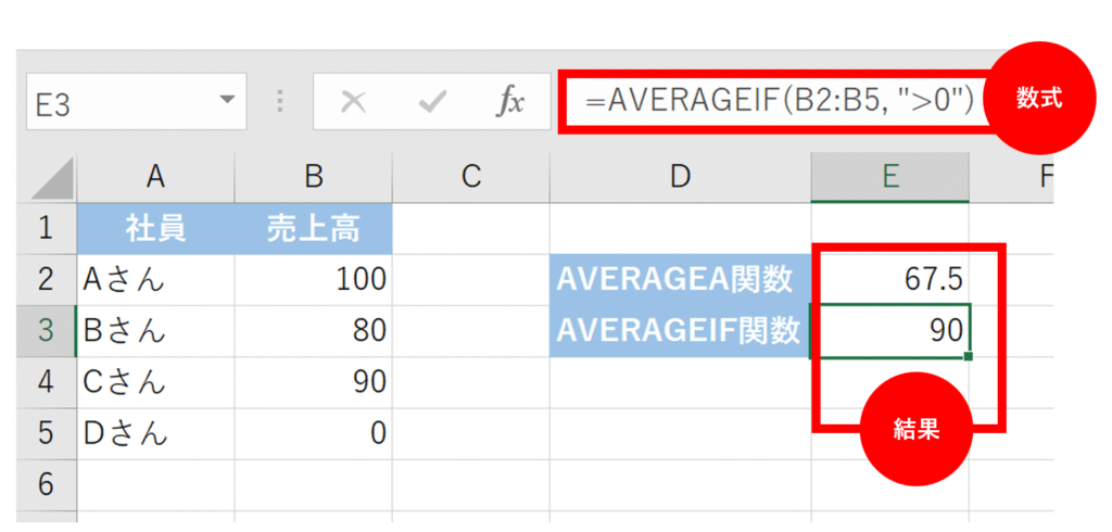 もし、データの中に「0」が含まれ、その「0」を除外して平均値を求めたい場合は、AVERAGEA関数ではなくAVERAGEIF関数を使う必要があります。