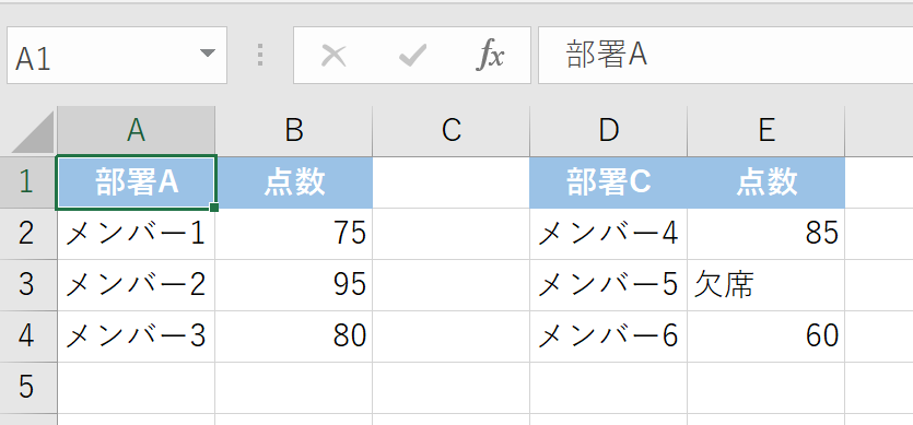 部署A(B2:B4)と部署C(E2:E4)の点数を合算して平均を求めたい場合を考えます。
