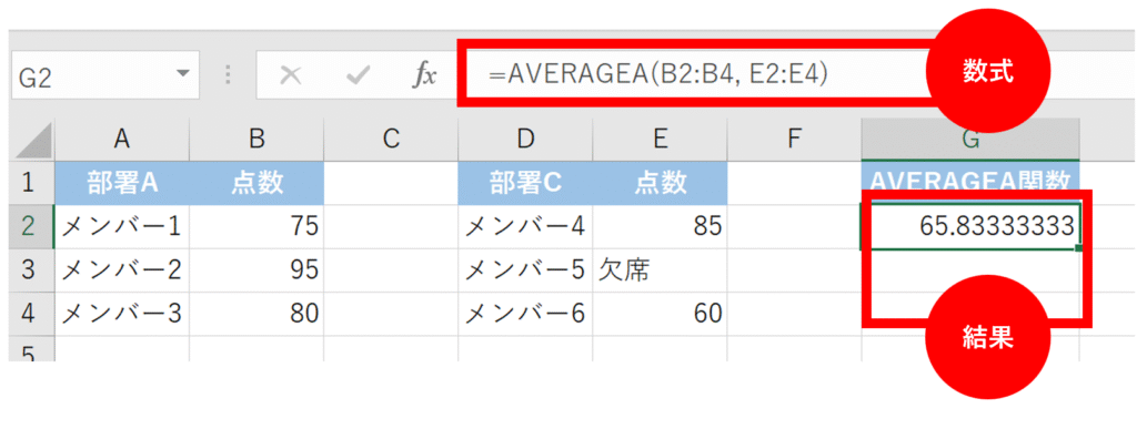 - AVERAGEA関数の結果: 65.8 → (75 + 95 + 80 + 85 + 0 + 60) / 6