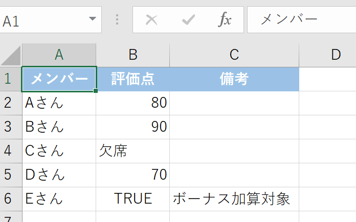 以下の表は、あるプロジェクトのメンバーごとの評価(点数)を示しています。欠席者は「欠席」という文字列で、ボーナス加算対象者は「TRUE」という論理値で入力されています。