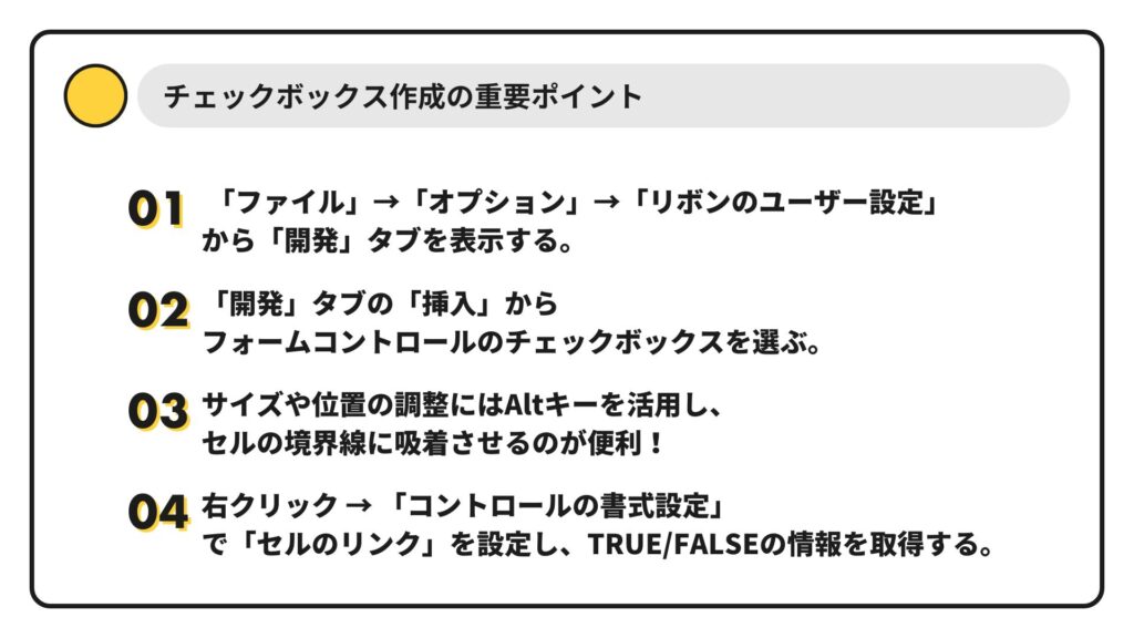 Excelのチェックボックスは、タスクリスト、進捗管理表、アンケートフォームなど、実務で役立つ機能です。