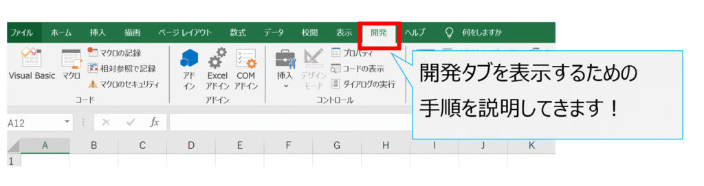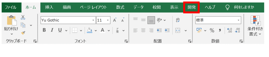 これで、Excelのリボン(画面上部のメニュー)に、新しく「開発」タブが表示されました!