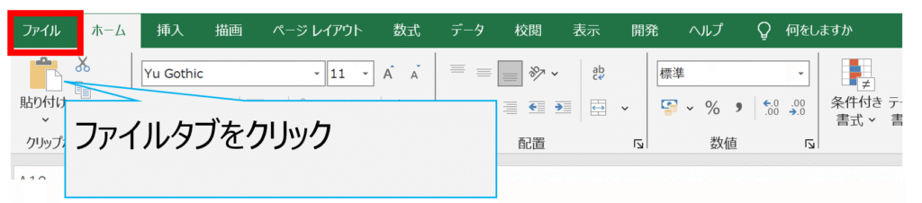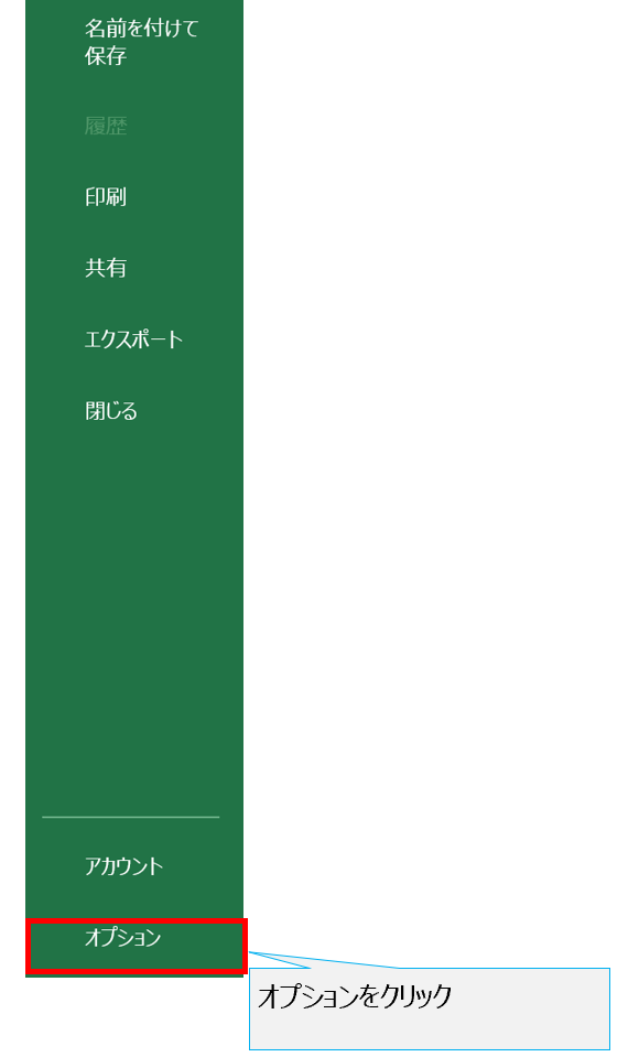 Excel画面の上部にある「ファイル」タブをクリックし、左側のメニューの一番下にある「オプション」を選択します。