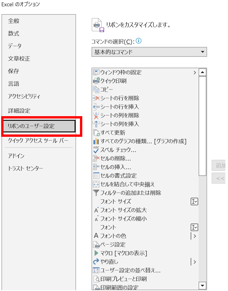 「Excelのオプション」ダイアログボックスが表示されたら、左側メニューから「リボンのユーザー設定」を選んでクリックします。