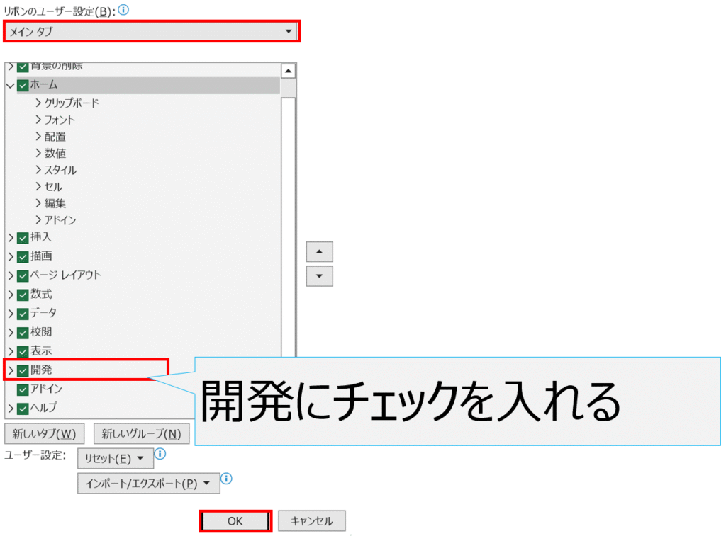 画面右側の「メインタブ」という項目のリストから、「開発」を探してチェックマークを入れます。チェックを入れたら、「OK」ボタンをクリックして設定を完了です。