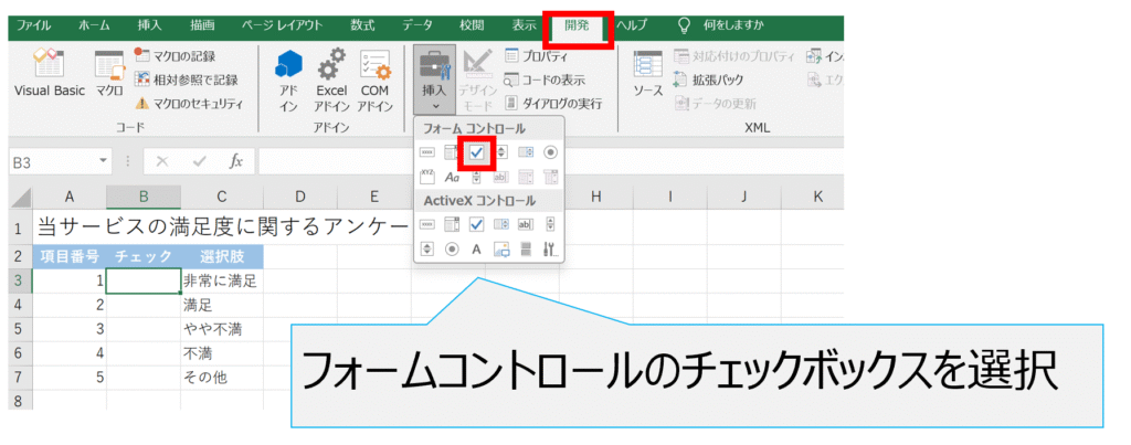 「開発」タブの準備ができたら、いよいよチェックボックスをシートに挿入してみましょう!