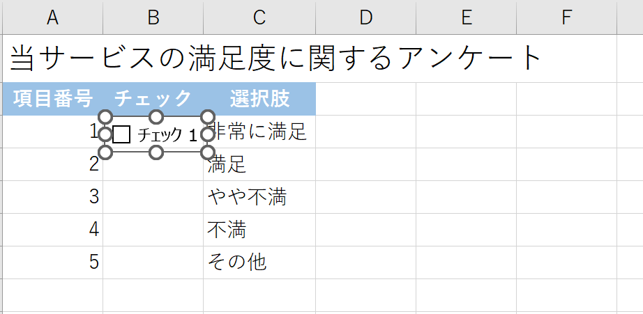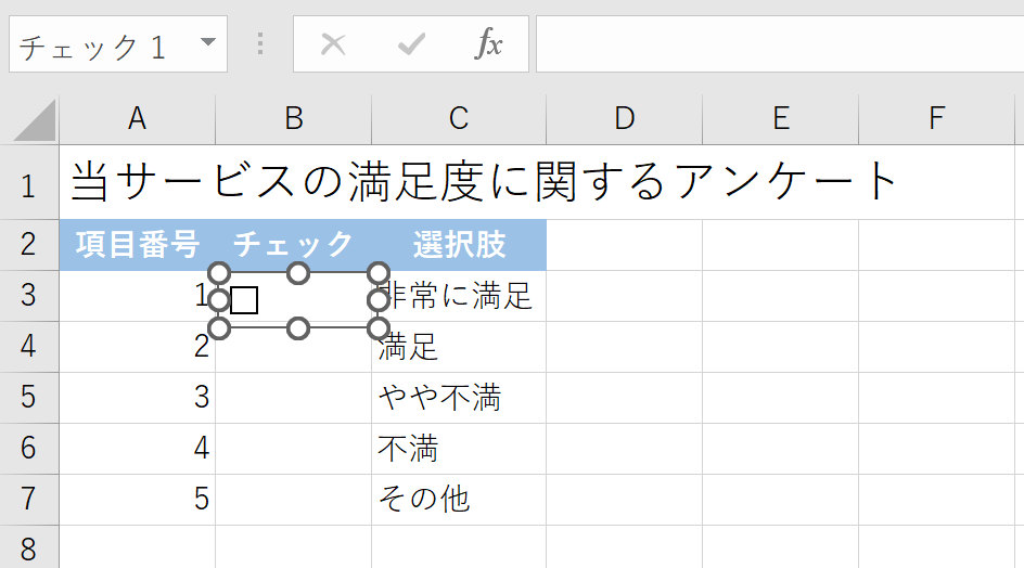 マウスカーソルが十字の形に変わったら、チェックボックスを挿入したい場所(セル付近)でクリックします。すると、初期設定のチェックボックスがシート上に作成されます。