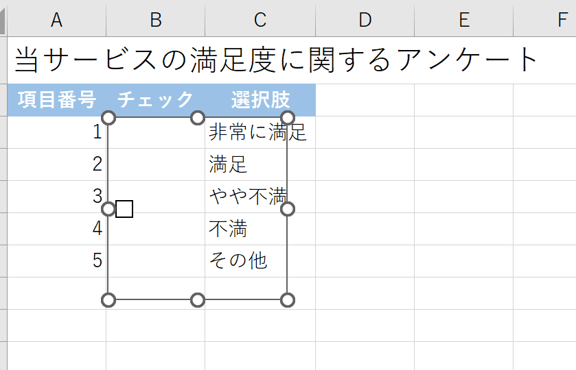チェックボックスのサイズは、挿入直後にマウスでドラッグする以外にも、いつでも変更可能です。