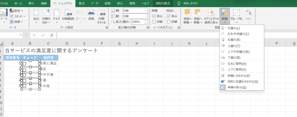 複数のチェックボックスを作成した場合、位置がバラバラだと見栄えが良くありません。Excelの図形機能を使って、一瞬で整列させましょう!
