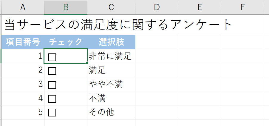 今回は例として以下画像B列にチェックボックスを挿入していきます。