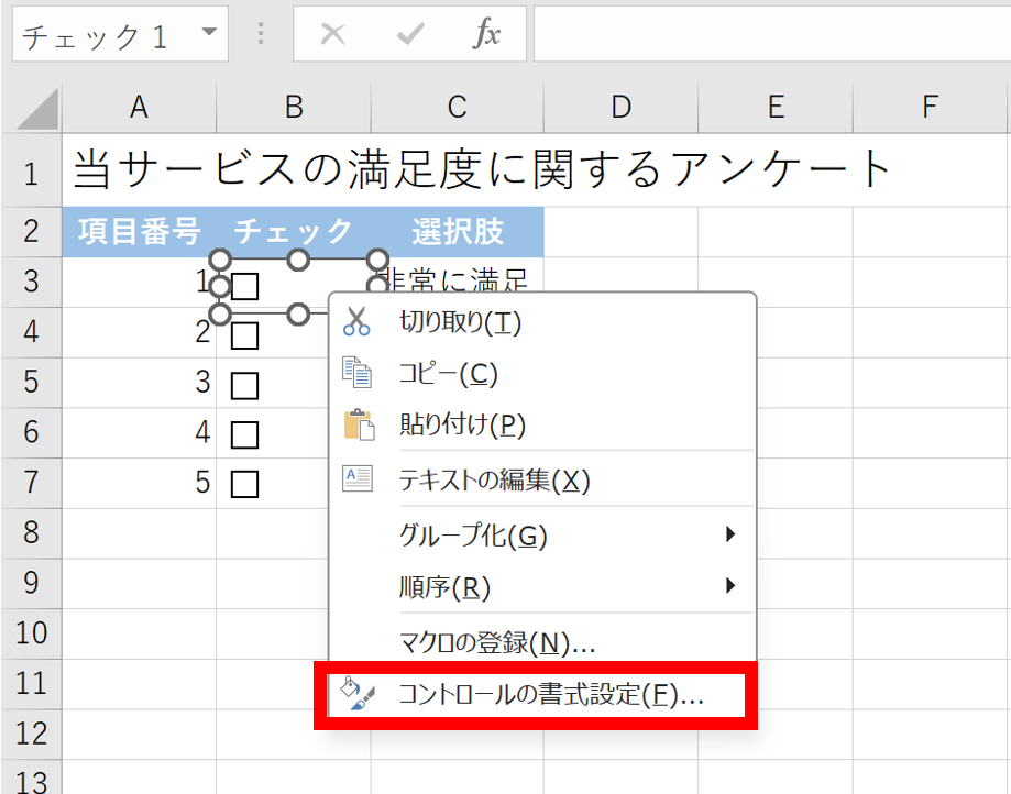 - 表示されたメニューの一番下にある「コントロールの書式設定」を選択します。