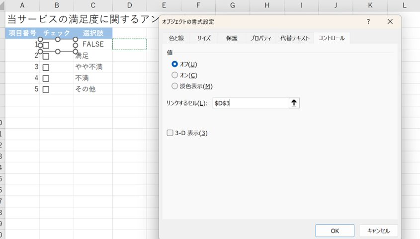 「セルのリンク」という項目に、チェックボックスの状態を反映させたいセルの番地を入力します。(例: $D$3)