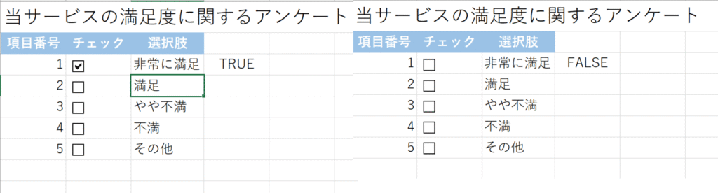 - チェックを外した状態 → リンクしたセルに「FALSE」(偽)と表示されます。