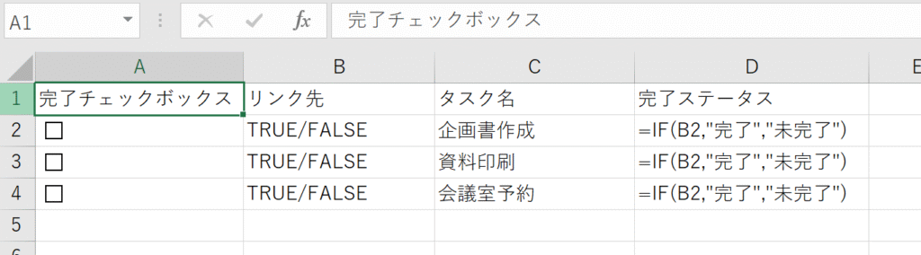 B2セルが TRUE(チェックあり)なら「完了」、そうでないなら( FALSE のとき)「未完了」と表示します。D3、D4セルにも同じ関数をコピーします。