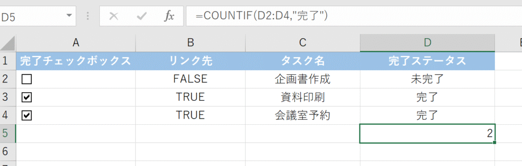D5セルに、完了数をカウントするためのCOUNTIF関数を入力します。