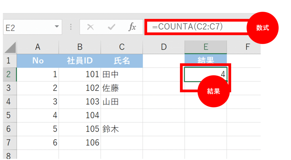 この表でC2セルからC7セルまでを範囲に指定すると、C5セルとC7セルは空白(何も入力されていない)のため、入力されている件数は「4」になります。