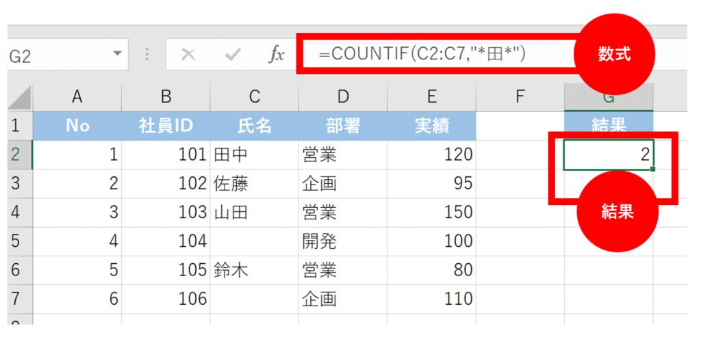 「氏名に田という文字が含まれる」社員の件数を数えたい場合