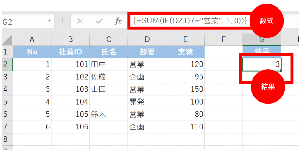 =SUM(IF(D2:D7=”営業”, 1, 0))